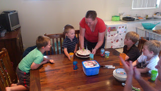 Our little baby turned 3 today! He had a nice morning of opening presents on our bed first thing, then we went to the park for a play. Came home after that and had lunch and a sleep, then woke up to play with our friends Jack and Archie (Simons boys) who also brought him a present, then time for a swim and a play on the Wii. Dinner time with Ben, Kate and James who had another present, and then a mummy baked birthday cake! Busy birthday boy.